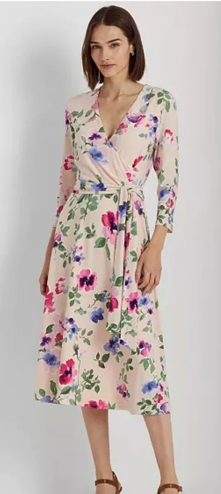 Elegant floral wrap dress with vibrant pink and blue accents. Perfect for any occasion. Brand new w... Show more