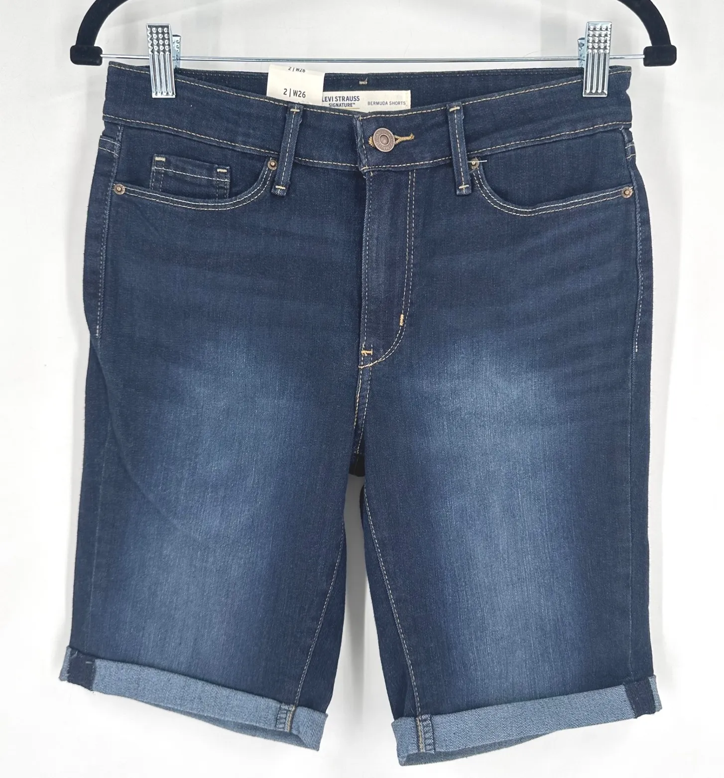 Measurements: • Waist: 26 inches • Inseam: 9 inches Style: Bermuda Department: Women Fabric Type: Denim Material: Cotton, Spandex, Denim Blend Theme: Classic Occasion: Casual, Workwear Accents: Button Pattern: Solid Features: Pockets, Stretch, Cuffed Waist Size: 26 in Fit: Slim Front Type: Flat Front Keywords: Levi Strauss Signature Gold, Women's Bermuda Shorts, Size 2W26, Dark Wash Denim, Mid Rise Shorts, Slim Through Hip and Thigh, Soft Stretch Fabric, Casual Wear, Summer Shorts, Jean Shorts, Fashion Shorts, Lightweight Denim, Cuffed Hem Shorts - Good pre-owned condition. No flaws. - I ship within 1-2 business days. - All items from a smoke free home..