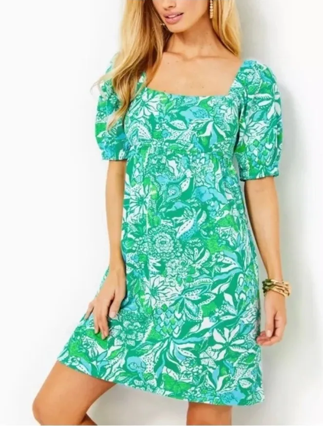Make a statement with this charming Lilly Pulitzer dress. A burst of botanical green and safari sangria colors dance across the soft cotton fabric, creating a vibrant and eye-catching design. The flattering square neckline and short puff sleeves add a touch of playful elegance, while the shirred elastic bodice accentuates your silhouette with comfort and ease. The gathered skirt flows gracefully, making it perfect for a sun-drenched picnic in the park, a casual brunch with friends, or a stylish garden party.