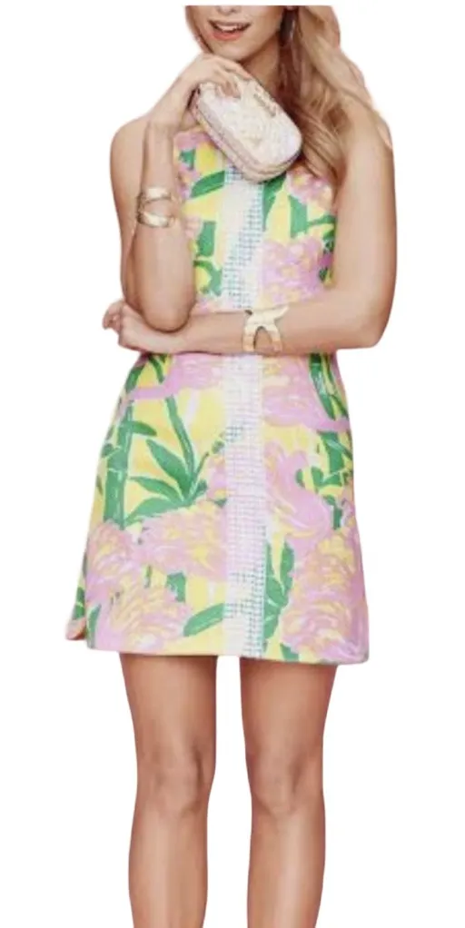 Lilly Pulitzer Chic Pink Flamingo with Green Floral Overall Print Lined Cotton Mini Dress New with T... Show more
