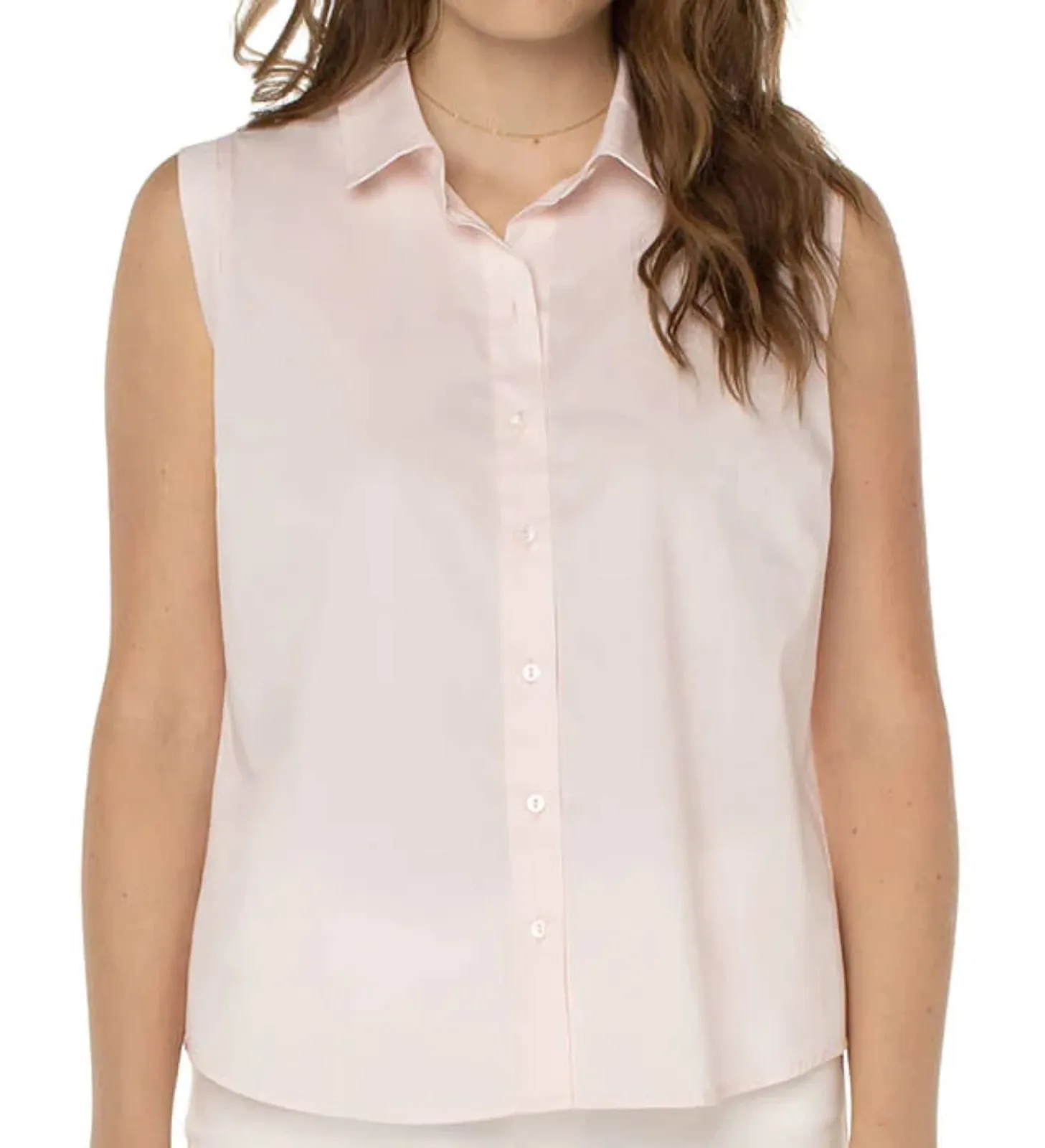 Easy to style up or down, this stretch-poplin top is cleanly styled with a spread collar, a fitted silhouette and a curved high-low hem. Size: XS Color: Light Peony Pink Spread collar Sleeveless 69% cotton, 28% nylon, 3% elastane Machine wash, dry flat NWT XX-17