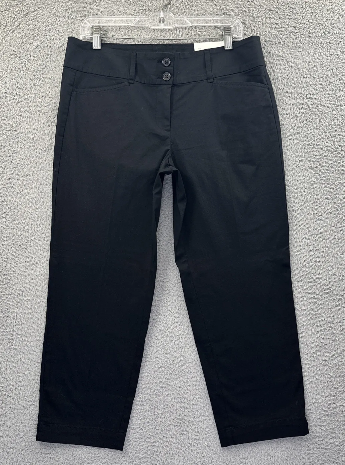 Mid rise Zipper fly, double button closure Front pockets Faux back pockets Straight leg Cropped leng... Show more