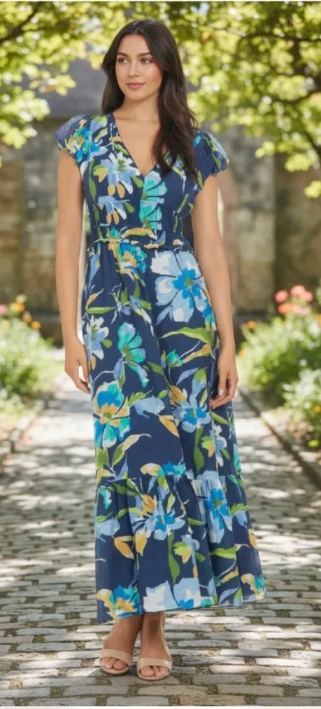 A charming floral print adorns an Empire waist chiffon maxi dress framed by bubbly cap sleeves and a... Show more