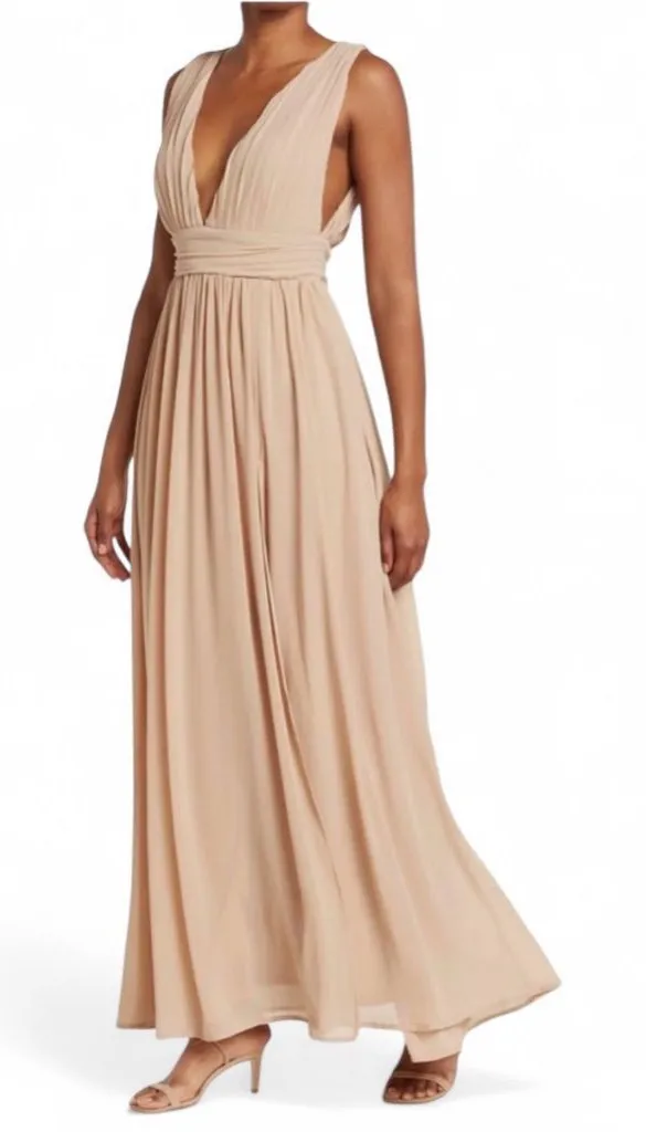 Make an entrance at your next special occasion in the "Athen" dress by Love By Design. This stunning nude beige maxi dress is New With Tags and perfect for a formal event, prom, gala, or as a sophisticated wedding guest outfit. It features a dramatic plunging V-neckline with elegant pleated detailing on the bodice and straps. The empire waist flows into a floor-length skirt with a thigh-high front slit (approx. 31 inches), adding movement and a touch of allure. The sheer, chiffon-like overlay gives it a romantic, ethereal feel suitable for any evening affair. Condition: New With Tags (NWT) - Nordstrom tag attached. Size: Medium (M) Small snag on shoulder to leave see close up photo. Features: Silhouette: A-line maxi with a fitted empire waist. Neckline: Deep V-neck front and V-back. Details: High front slit, pleated bodice, hidden back zipper closure. Occasion: Ideal for bridesmaids, black tie events, or winter formals. Measurements (Approximate): Waist (flat): 13" Length (shoulder to hem): 61" Slit Length: 31" Fabric Content: Shell: 100% Polyester Lining: 100% Polyester Carefully stored in a pet-free, smoke-free home.
