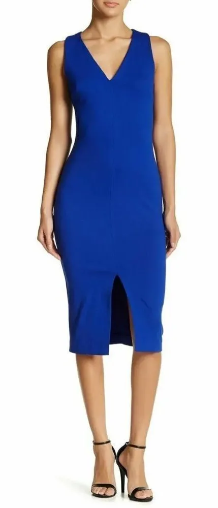 Get a sophisticated look in this classic bodycon that has a flirty front slit and a V-neck for a flash of skin. - V-neck - Sleeveless - Back zip closure - Front slit - Made in USA