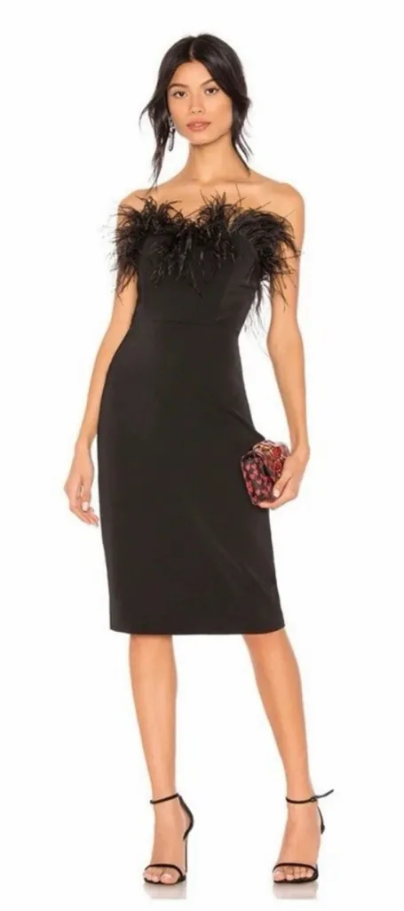 LPA Dress NEW with tags Black strapless stretchy evening midi dress featuring: -Ostrich feather... Show more