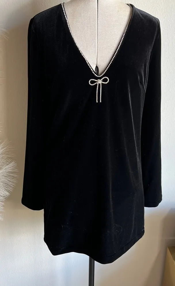 NWT Lucy Paris Velvet Mini Dress *stock images from Lucy Paris* FIT: small fits true to size MEASUREMENTS: Pit to pit: 18” flat Length: 31” DETAILS: Long sleeve Plunging v neckline Rhinestone trim detail around neck Bow detail FABRIC: velvet STYLING: the perfect mini dress for the holidays! Add flats for all day comfort or strappy heels for a holiday party! TAGS Black velvet mini dress, long sleeve mini dress, rhinestone mini dress, holiday dress, cocktail dress, holiday party, velvet mini dress, Lucy Paris mini dress, feminine, romantic, chic, contemporary, bow dress, plunging neckline mini dress