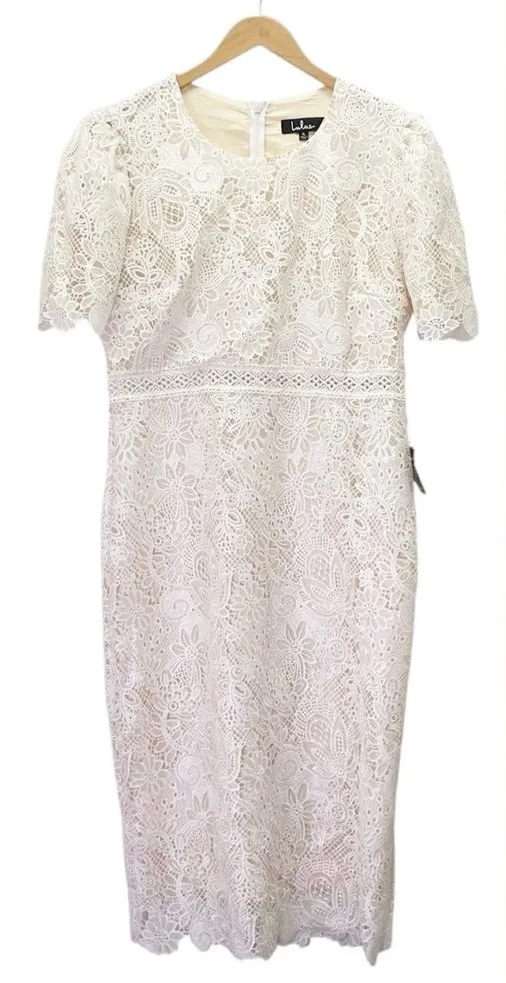 bridal shower, elopement dress, graduation dress, wedding guest, rehearsal dinner, lace midi, white dress, romantic lace, Lulus bridal, XL dress, NWT dress, modest dress, figure-flattering, crochet lace, lined dress, spring wedding, engagement party, garden wedding, classic white, fitted dress