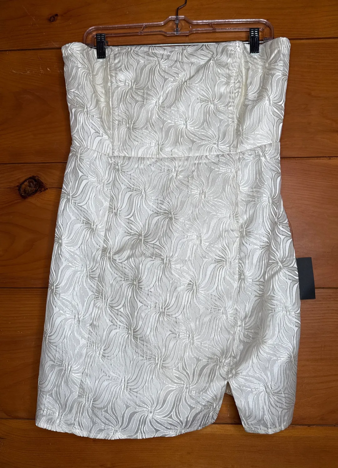 An intricate floral-inspired design adorns this jacquard dress that falls from a sleek straight neckline into a strapless bodice with supportive boning. The bodycon silhouette finishes with a notched mini hem for a look designed to make you feel your most confident. Hidden no-slip strips and back zipper/clasp.