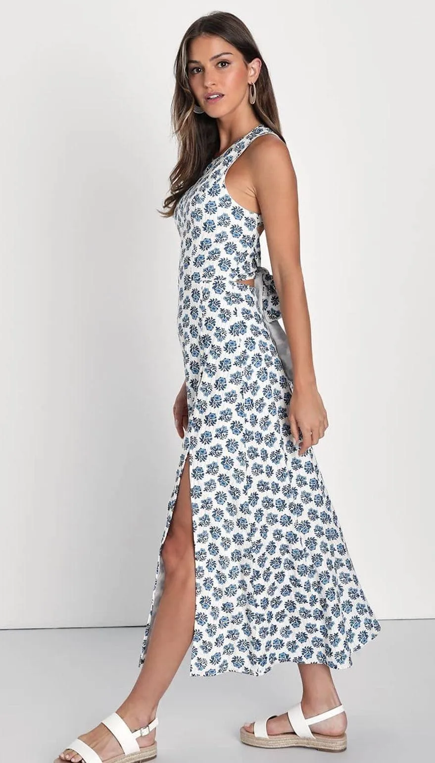 NWT Lulus Flirty Fave Ivory Floral Print Tie-Back Midi Dress Bohemian Summer L Blue Size L - $45 New With Tags - From Irena