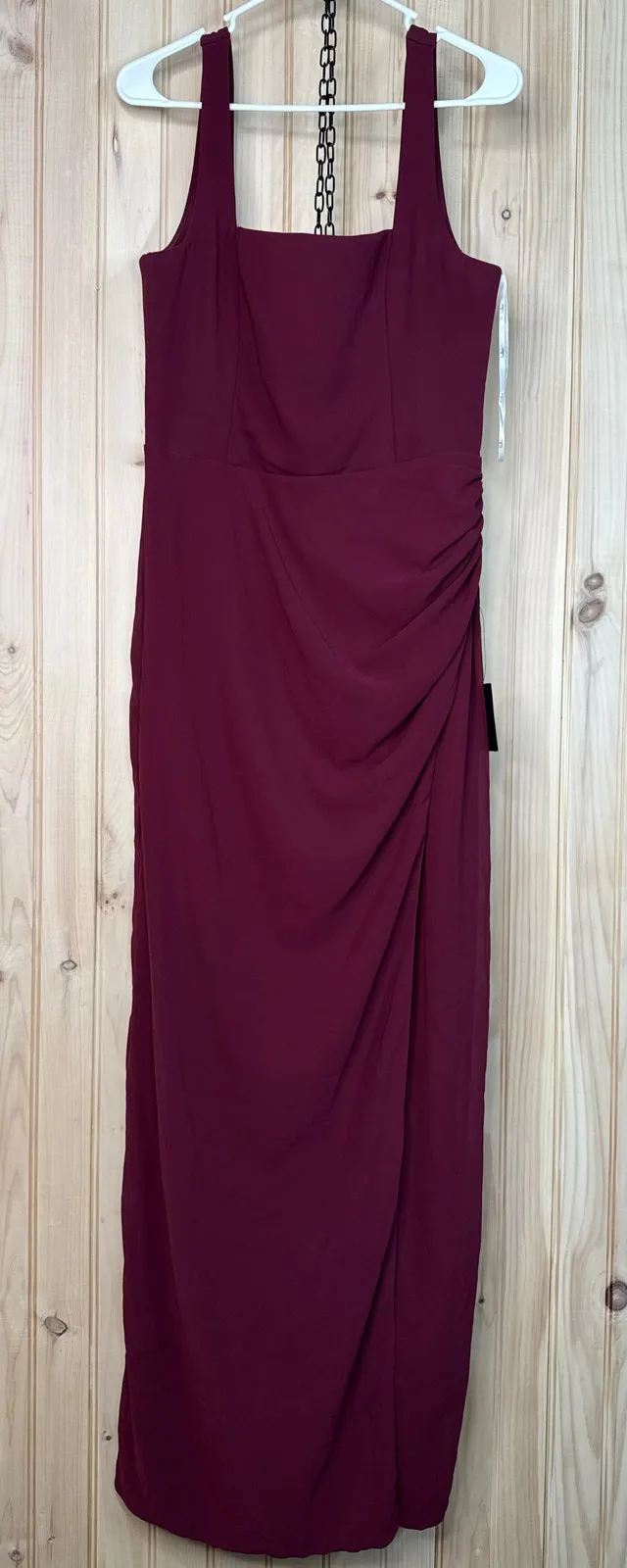 This airy chiffon dress will have everyone impressed the moment you strut into the room. The princess-seamed bodice features a square neckline and wide straps, atop a figure-skimming skirt with a fitted waist, an overlapping design with side ruching, and a chic maxi hem. Hidden back zipper/clasp.