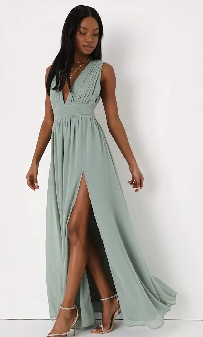 You'll be goddess-like for the entire evening in the Lulus Heavenly Hues Sage Brush Maxi Dress! Airy woven chiffon drapes alongside a V-neck and back, and lays across a banded waist. Full maxi skirt has a sexy side slit. Hidden back zipper with clasp.
