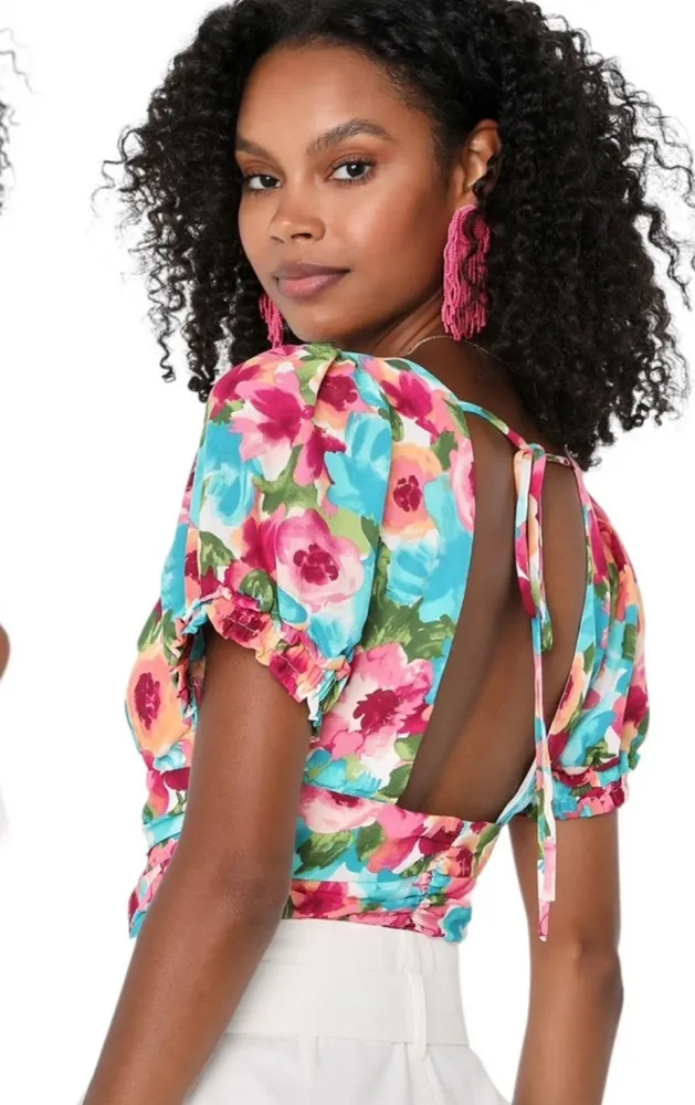 NWT Lulus Hues of You Teal Multi Floral Print Ruched Puff Sleeve Top Size XS New with tag Full pr... Show more