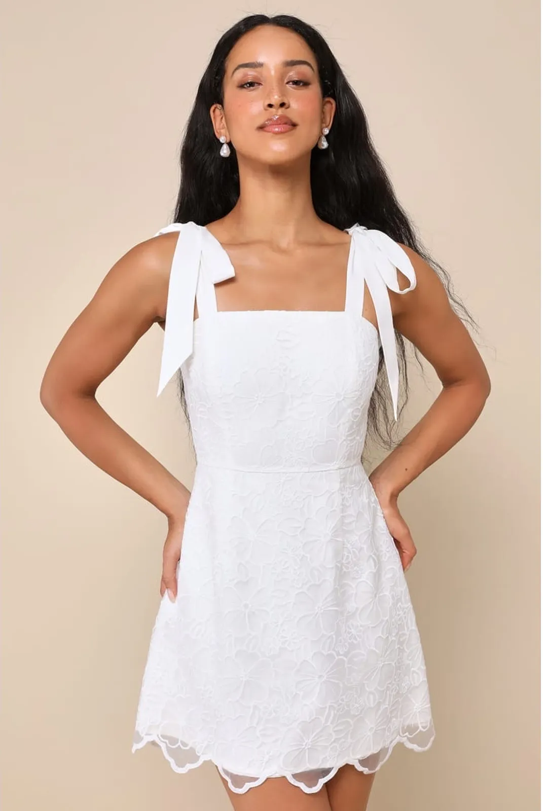 Charm the socks off everyone you meet in the Lulus Lovable Aesthetic White Embroidered Tie-Strap Mini Dress! Sheer woven organza, with pretty floral embroidery throughout, shapes this adorable dress that falls from tying shoulder straps into a square neckline and a princess-seamed bodice. High, fitted waist sits atop a cute A-line skirt that ends at a scalloped mini hem. Hidden back zipper/clasp.