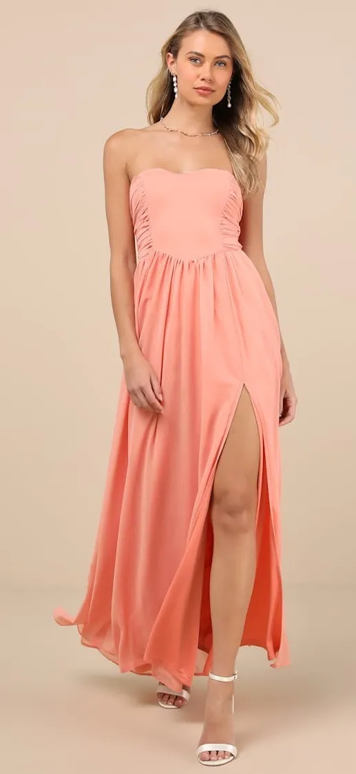 Fabulousness comes easy when you have a charming look like the Lulus Luxe Favorite Peach Pink Strapless Ruched Maxi Dress! Airy woven chiffon shapes this whimsical dress that features a strapless bodice with flattering ruched panels at the side and a sweetheart neckline (with hidden no-slip strips). A trendy, Basque-style waist tops a flowy, A-line skirt that falls to a maxi hem with a sultry side slit. Hidden back zipper/clasp.