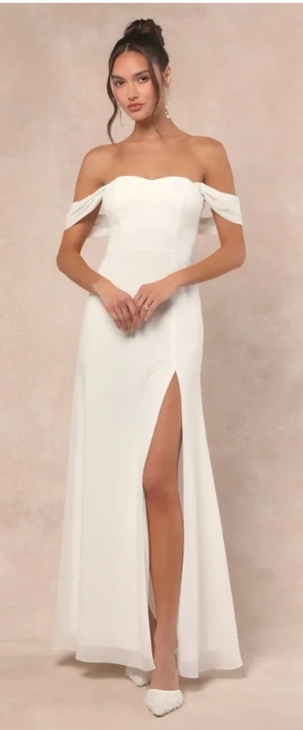Airy woven chiffon shapes lightly gathered straps that frame an off-the-shoulder neckline (with hidden no-slip strips) and the fitted bodice that features flattering seam detailing. The fitted waist tops a figure-skimming skirt that falls to a sweeping maxi hem, accented with a side slit for a flirty finishing touch! Hidden back zipper/clasp.