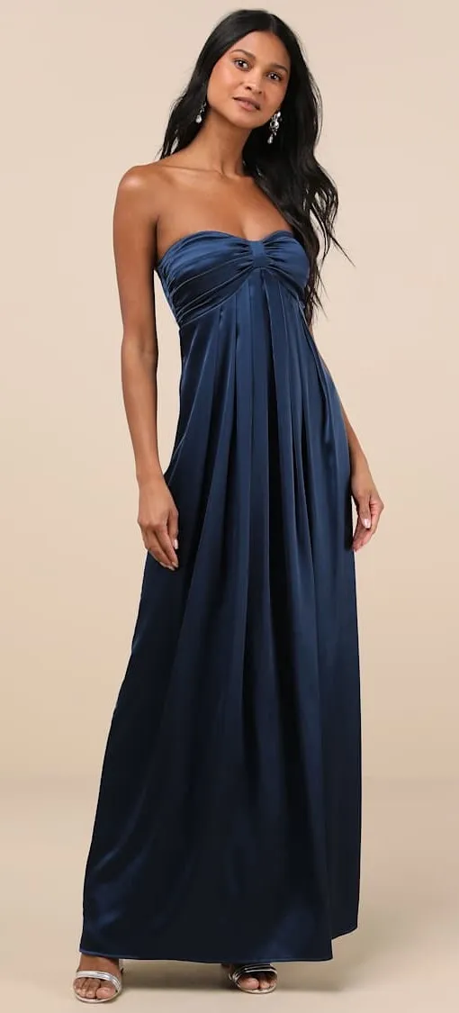 From the moment you walk in, you'll be bringing the glamorous vibes in the Lulus Memorable Entrance Dark Blue Strapless Satin Maxi Dress! Sleek woven satin (with pleated details) shapes this stunning dress that has a strapless bodice with a sweetheart neckline (with hidden no-slip strips) and lightly padded cups. High, empire-style waist tops an A-line skirt that falls to a maxi hem. Hidden zipper/clasp at back.