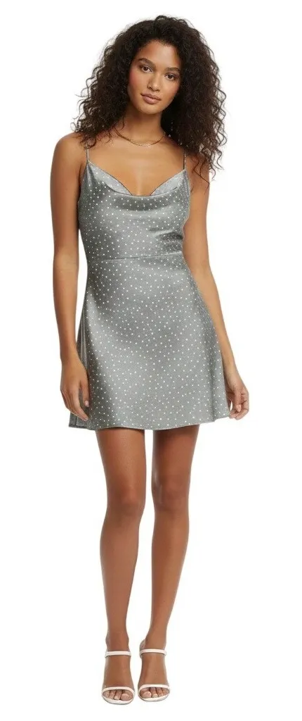 Style Name: Spot in My Heart Sage Grey Polka Dot Satin Cowl Neck Mini Dress Cowl neck Mini length Sp... Show more