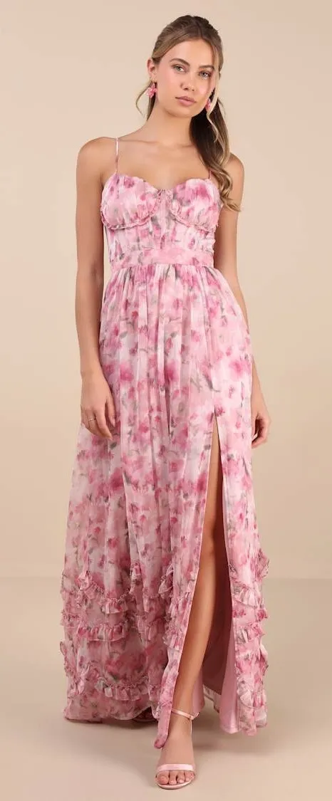 Capture the hearts of everyone in the room in this floral chiffon gown that falls from adjustable straps into a cascading A-line silhouette. The bustier-style bodice features pleated cups, a ruffled under-bust detail, and supportive boning. Ruffled tiers and a side slit accent the full skirt, while a lace-up back completes the look. Hidden back zipper/clasp.