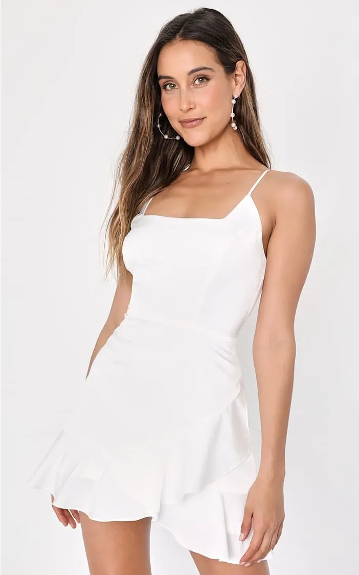 You'll have everyone wrapped around your finger when you step out in the Lulus Romantic Angel White Satin Square Neck Ruffled Mini Dress! This adorable dress has a sleek woven satin composition that falls from adjustable spaghetti straps into a square neckline and a princess-seamed bodice. High, fitted waist sits atop a cute A-line skirt that ends at a ruffled mini hem. Hidden back zipper/clasp.
