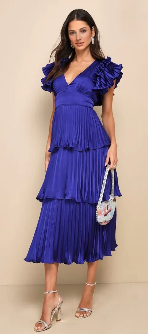 Sleek pleated woven satin lends luxe dimension to this fabulous dress that features flouncy, ruffled short sleeves and a lightly gathered bodice with an alluring V-neckline. A flattering set-in waist tops a figure-skimming, A-line skirt that boasts tiered layers as it cascades down to an elegant midi hem. Hidden back zipper/clasp.