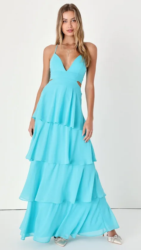 This obsession-worthy dress skims your figure with a lightweight, chiffon fabrication that falls from slender straps into a plunging bodice. Show off the perfect amount of skin with the cutout back that wraps the waist and secures with sash ties, all atop a tiered maxi skirt. Hidden back zipper/clasp.