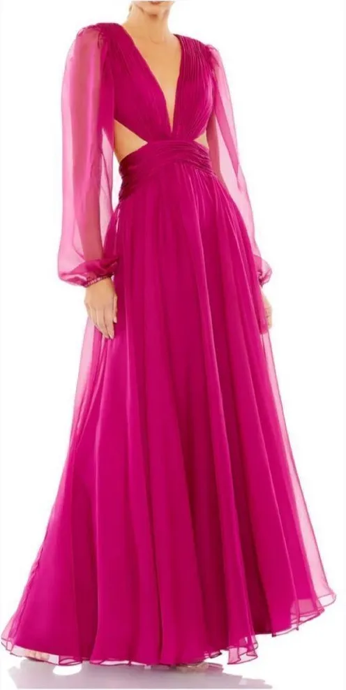 Details: Ieena for Mac Duggal Size: 12 Color: Berry Organza fabric (100% polyester) Fully lined through body; sheer unlined sleeves Plunge neckline Long puff sleeves Ruched bodice and cummerbund Side cutouts Open back Concealed back zipper Approx. 62.5" from top of shoulder to bottom hem Style #55823 Approximate Measurements: Underarm to underarm: 20.5" Across waist: 17.5" Influencer Statement Piece, bridesmaids, black tie, gala, formal wear, prom, homecoming, pageant, wedding guest, bridal, wedding, bridal shower, mother of the bride, mother of the groom, rehearsal dinner, bachelorette, pageant, prom, homecoming, wedding, engagement photos, special occasion, little black dress, gala, Graduation, holiday parties, pageant, Quinceañera, formal, black tie, cocktail, Maid of honor, Special occasion, Designer Event, Dinner gown, Photo shoot, Formal event, Celebrity Red Carpet Luxe Luxury, Holiday, Vacation Resort wear, Beach dress, Spring, Summer, Fall, Ballgown, Gown Boho Bohemian