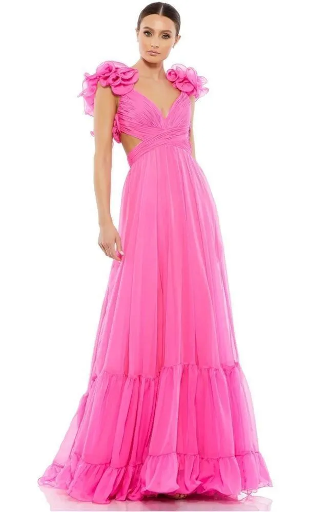 *There are some wrinkles on the front of the skirt. Please view pics. Details: Floor length tiered gown with sexy side cutouts, a lace-up back, and dramatic ruffles at the shoulder. This best selling silhouette is flattering on most body types. Mac Duggal Size: 4 Color: Hot Pink Chiffon Fabric (100% polyester) Fully lined V-neck Short sleeve Draped pleated bodice Ruffle shoulder detailing Lace-up back Back zipper Approx. 62.5" from top of shoulder to bottom hem Style #67911 Approximate Measurements: Underarm to underarm: 17" Across Waist: 13" Influencer Statement Piece, bridesmaids, black tie, gala, formal wear, prom, homecoming, pageant, wedding guest, bridal, wedding, bridal shower, mother of the bride, mother of the groom, rehearsal dinner, bachelorette, pageant, prom, homecoming, wedding, engagement photos, special occasion, little black dress, gala, Graduation, holiday parties, pageant, Quinceañera, formal, black tie, cocktail, Maid of honor, Special occasion, Designer Event, Dinner gown, Photo shoot, Formal event, Celebrity Red Carpet Luxe Luxury, Holiday, Vacation Resort wear, Beach dress, Spring, Summer, Fall, Ballg