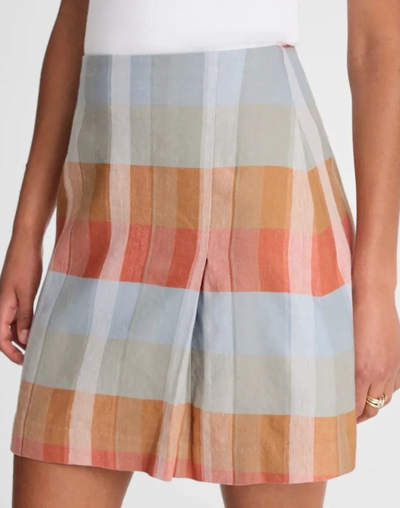 Meet your new go-to mini. This linen blend skirt features a single front pleat and a classic plaid p... Show more