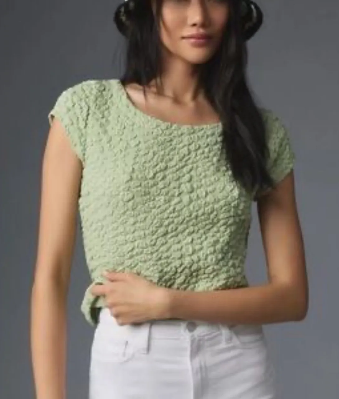 Pair the Popcorn Socialite Tee with high-waisted denim, linen trousers, or a floaty midi skirt for a chic, textural look that fits right into a capsule, coastal, or quiet luxury wardrobe. This piece balances playful texture with clean lines and modern structure. New with tags from Maeve by Anthropologie, this bestselling tee features allover popcorn-texture stretch fabric in a soft sage green. Designed with a scoop front neckline and deep scoop back for an elevated silhouette. Slight crop fit, with plenty of give thanks to the textured stretch. Size: Large Style No: CP6997 0015 Measurements (laying flat): Pit to Pit: 22 inches Length: 23 inches Condition: New with tags attached. Never worn. No flaws. A versatile and flattering piece that's great for layering or styling solo — easy to dress up or down depending on your mood.