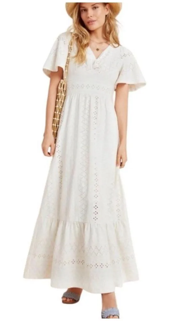 Step out in style with this elegant white eyelet maxi dress. Perfect for any occasion, this dress of... Show more