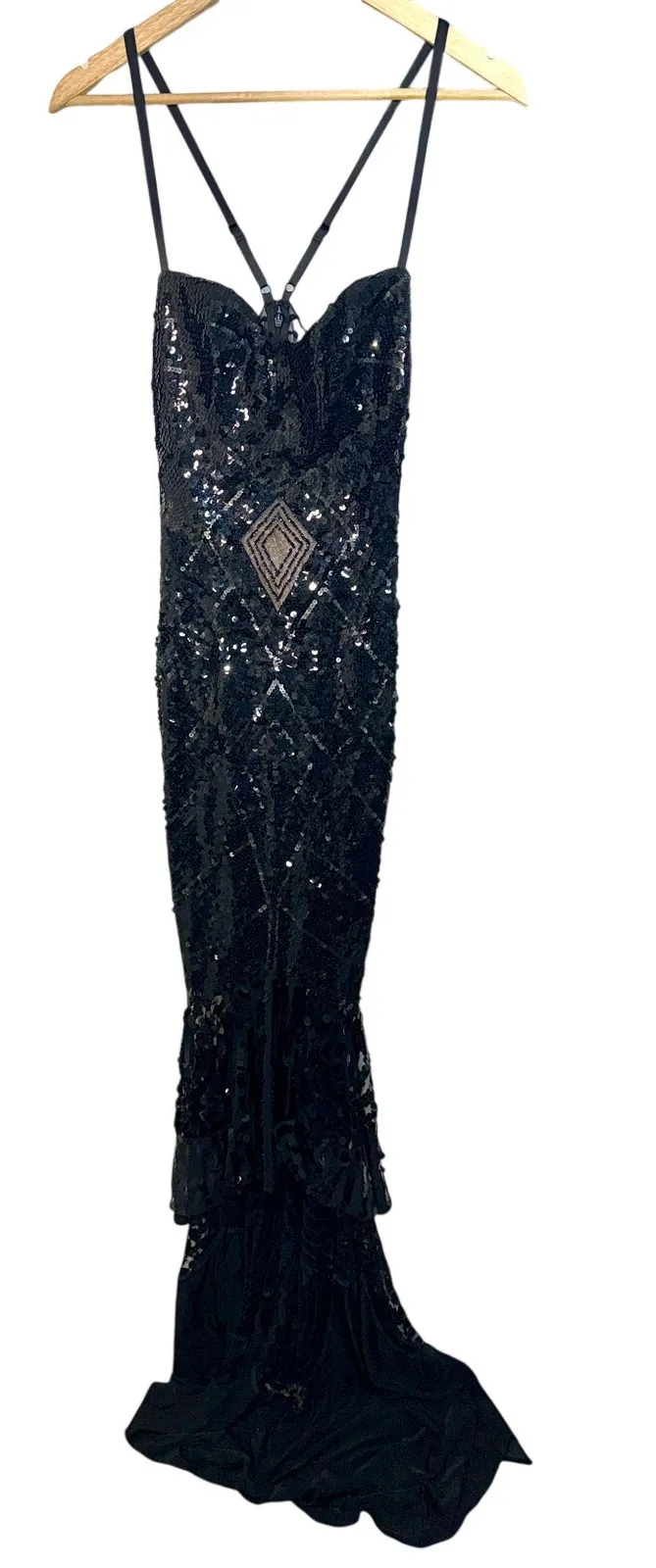NWT Mandalay Black Sequin High Low Maxi Gown Evening Formal Dress Womens Size 8 CONDITION: New With Tags. Brand: Mandalay Style Name: n/a Style Number: U01401DEBL US Women’s Size: 8 Manufacturer’s Color: Black Materials: 95% Polyester, 5% Spandex (Shell); 100% Nylon (Lining) Pattern: Solid, Sequin Country of Manufacture: China UPC: n/a SKU: MANDALAY-058 Box #: M10 Gender: Womens Category: Dresses Style: Evening Gown, Formal Dress, Maxi Dress, High Low Dress Style Tags: Sequin, Gown, Formal, NWT, Mandalay Season: Spring, Summer, Fall, Winter, All Seasons Density: Medium Weight to Heavy Weight Occasion: Evening, Formal, Wedding Guest, Gala, Special Occasion Theme: Elegant, Luxury, Designer, Glam, Modern, Contemporary Features: • All Over Sequin Embellishment • Black Colorway • Fitted Column Silhouette • Spaghetti Strap Design • Sheer Mesh Back Panel • High Low Hemline • Fully Lined Interior • Hidden Back Zipper Closure • Floor Length Gown • New With Original Tags Attached Description: This Mandalay evening gown features an elegant black colorway accented with all over sequin embellishment for a striking, high-glamour finish. Designed with a fitted column silhouette, delicate spaghetti straps, and a dramatic high low hemline, this gown offers beautiful movement and modern sophistication. The sheer mesh back detail adds a refined designer touch, making it ideal for galas, formal events, and upscale evening occasions. *Brand new with original tags attached.* MSRP = $1699
