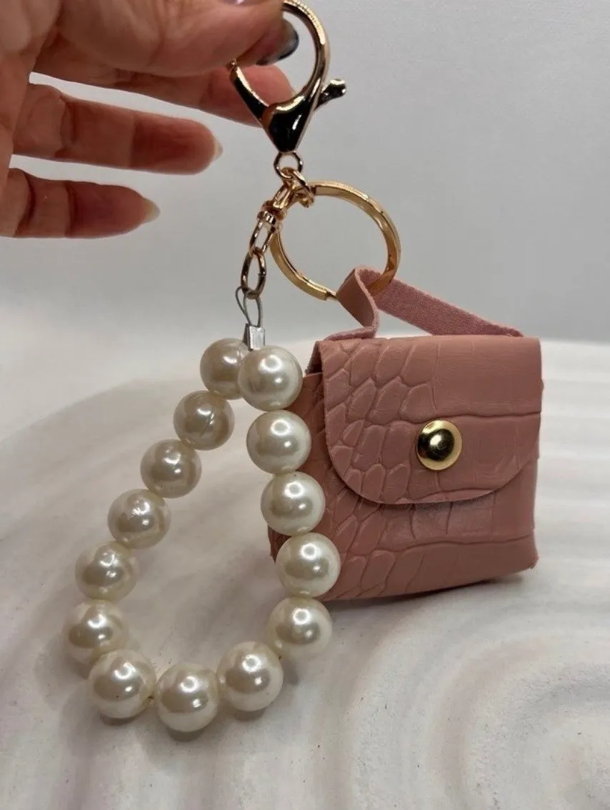 Chic and practical mini purse keychain in pink faux crocodile leather with a detachable pearl handle... Show more