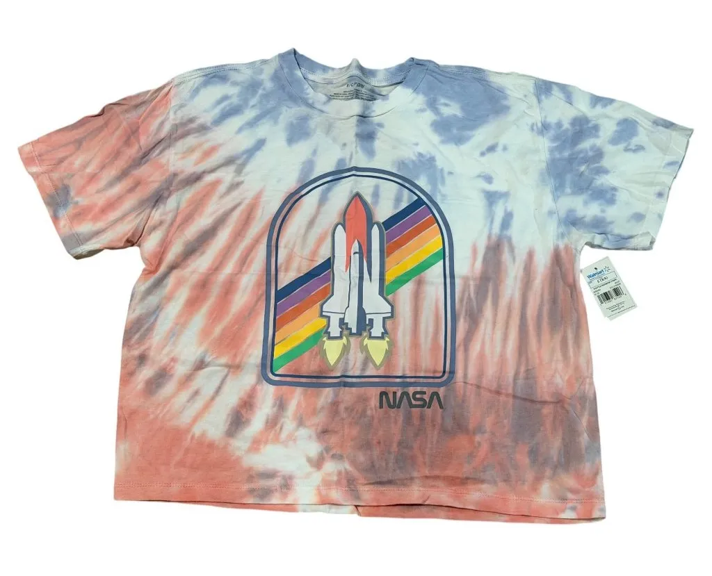 This tie-dye shirt features a vibrant NASA shuttle graphic with rainbow accents. Comfortable 100% co... Show more