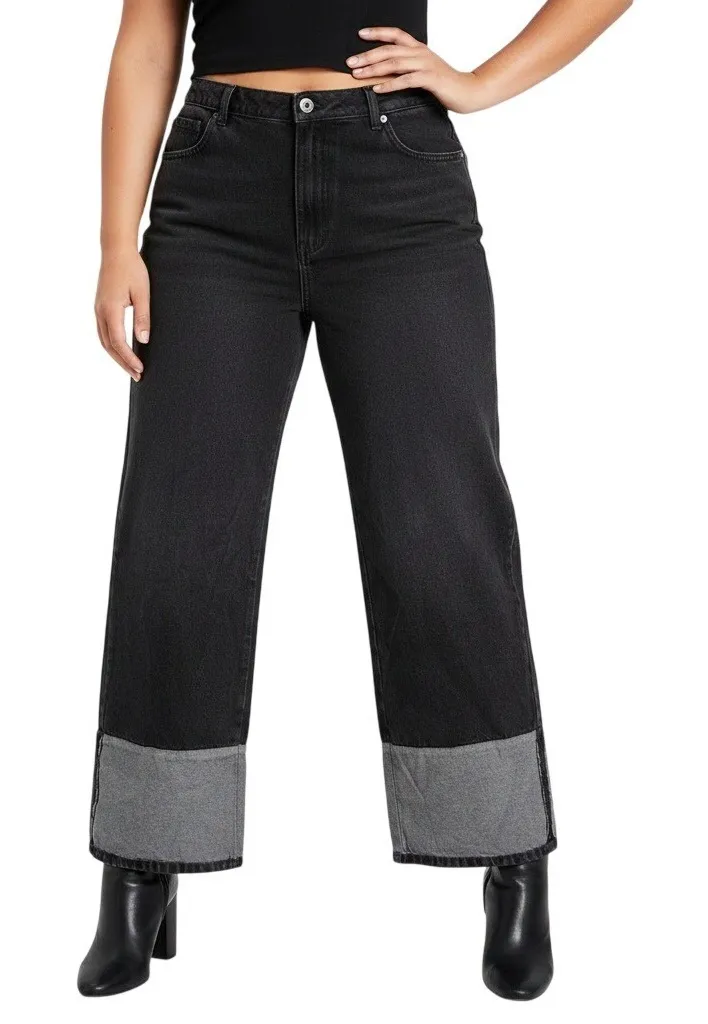 Style Name: Plus Size Organic Denim Contrast Hem Jean Washed Black High-waisted Wide-leg fit Contras... Show more