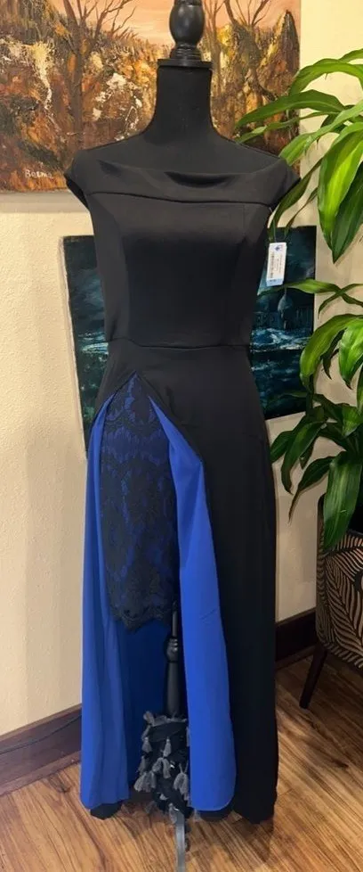 NWT NEW YOUR COMPANY GOWN STRETCH TOP PART OF DRESS LONG CHIFFON SKIRT WITH OPENING FOR A LACE SHORT SKIRT UNDER TO BE SEE. Beautiful effect. Dress well made. Royal blue and black color Size Small