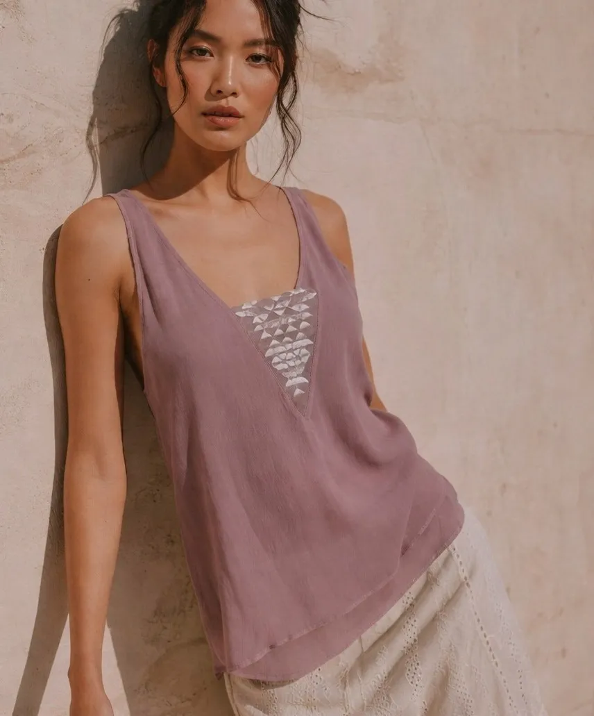 New with tags Sleeveless Deep V-neckline Tie back closure Sheer woven fabric Lightweight Relaxed fit Flowy hem Solid pattern Unlined Layering piece Bohemian Festival Coastal Beachy Indie Resort Vacation Romantic Whimsy Approx. Measurements: Pit to pit: 18" Length: 26.5"