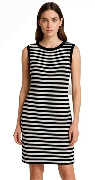 Measurements: • Pit to pit:18" stretches to 23" • Length: 38" Style: Sweater Dress, Sheath, Shift Dress Length: Midi Department: Women Sleeve Length: Sleeveless Pattern: Striped Occasion: Casual, Workwear, Party/Cocktail Material: Tencel, Lyocell, Nylon, Fabric Type: Knit Theme: Classic Neckline: Boat Neck Season: Spring, Summer, Fall Closure: Pullover Keywords: Nicole Miller New York, Black White Striped Dress, Sleeveless Knit Dress, Midi Dress, Tencel Lyocell Dress, Nylon Blend Dress, Boat Neck Dress, Casual Dress, Work Dress, Day to Night Dress, Plus Size Dress, Summer Dress, Spring Dress, Fall Dress Excellent new condition, no visible flaws. Smoke-free, pet-free home. All items are washed/sanitized with hypoallergenic detergent and come ready to be worn! Bundle and save — check out my closet for more styles!