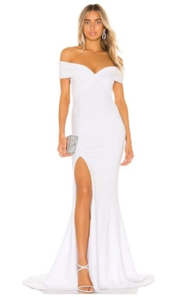 Brand new with tags! This dreamy Nookie Neptune Gown in white (Size Large) is the perfect modern bridal or formal evening gown. A viral favorite originally sold at Revolve, this ultra-flattering design features a curve-hugging silhouette, elegant off-the-shoulder neckline, dramatic thigh-high slit, and a subtle mermaid train for a show-stopping finish 🤍 Sleek, modern, and sculpting — designed to make a stunning entrance. Details • Brand: Nookie (Revolve) • Style: Neptune Gown • Size: Large • Color: White / bridal white • Fabric: 95% Polyester / 5% Spandex • Condition: New with tags Features • Off-shoulder sweetheart neckline • Fitted, body-con silhouette • Thigh-high front slit • Mermaid hemline with elegant train • Stretch, structured fabric for support and shape Condition Note • Tiny tear inside lining near slit; not visible when worn. See photo for reference. Perfect for • Bridal gown alternative • Engagement photos & rehearsal dinner • Formal galas & black-tie events • Prom, pageants, or white parties Fast shipping — ships same or next day Smoke-free home Keywords: wedding dress, white gown, bridal dress, formal gown, mermaid dress, evening gown, Revolve dress, Nookie gown