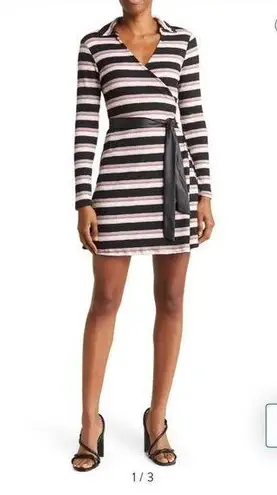 A classic striped pattern accents this long-sleeve sweater dress with a side-tie closure for a flatt... Show more