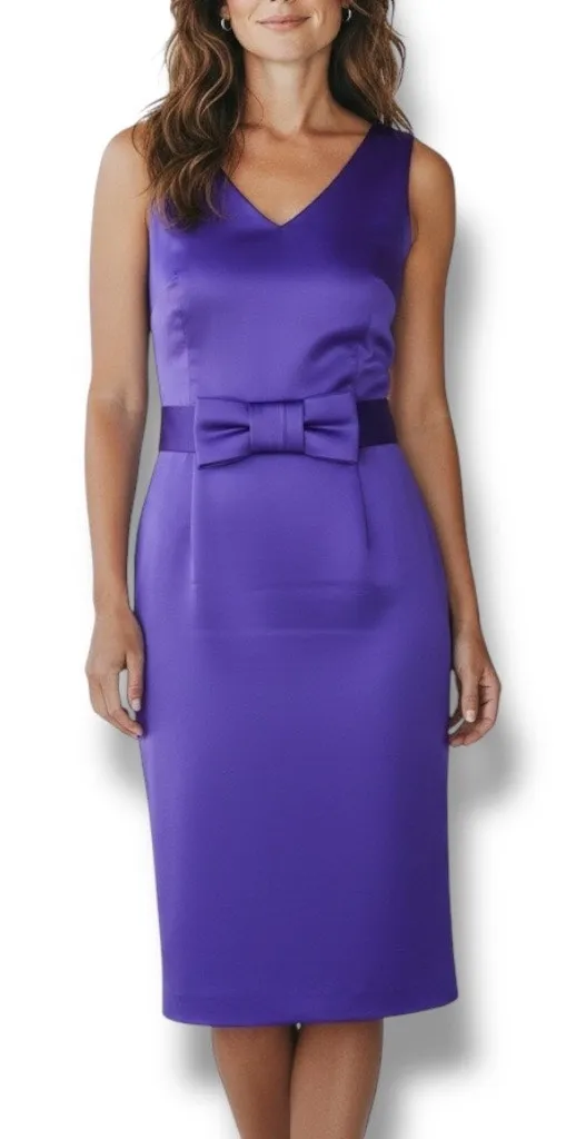 The NWT NUE by Shani Size 8 Purple Satin Sheath Dress is a stylish and elegant option for various occasions. This dress features a sleek V-neckline, sleeveless design, and a zip closure for a flattering fit. The built-in body shaper adds a slimming effect, while the knee-length hem and pencil dress style offer a sophisticated look. Perfect for travel, weddings, parties, and more, this dress is a versatile choice with a hint of designer flair.
