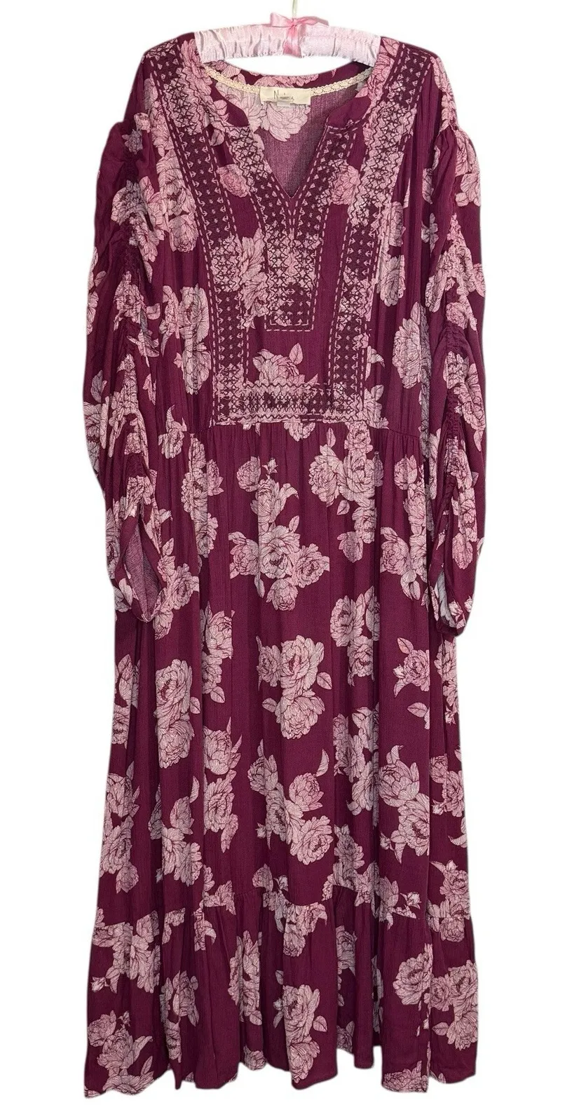 Romantic and effortlessly feminine, this Nurture by Westbound Woman boho maxi dress features a flowing silhouette in a deep plum purple base with blush floral print and delicate embroidered detailing along the neckline and bodice. Crafted from lightweight 100% rayon, the fabric drapes beautifully for a soft, flattering fit. The long sleeves have subtle scrunch-style gathers that add dimension and a relaxed, peasant-inspired look. The ruffled hemline and loose tiered flow give it graceful movement with every step. Perfect for casual days, weekend markets, fall photoshoots, or dressed up with boots and a belt for a rustic, romantic aesthetic. Details: Brand: Nurture by Westbound Woman Size: 3X (Plus Size) Color: Plum Purple / Mauve Pink Floral Material: 100% Rayon (Embroidery 100% Polyester) Length: Approx. 55" shoulder to hem Sleeve: Long with scrunch detail Neckline: Split V-neck with embroidery Hem: Tiered / Ruffled Care: Machine wash cold, tumble dry low Condition: Excellent, NWT Ships within 24 hours Keywords: nurture by westbound woman, 3x plus size maxi dress, boho floral embroidered dress, peasant long sleeve dress, fall boho outfit, cottagecore prairie dress, vintage-inspired floral, romantic flowy rayon dress, tiered ruffle hem, festival dress, feminine floral maxi, soft rayon boho style
