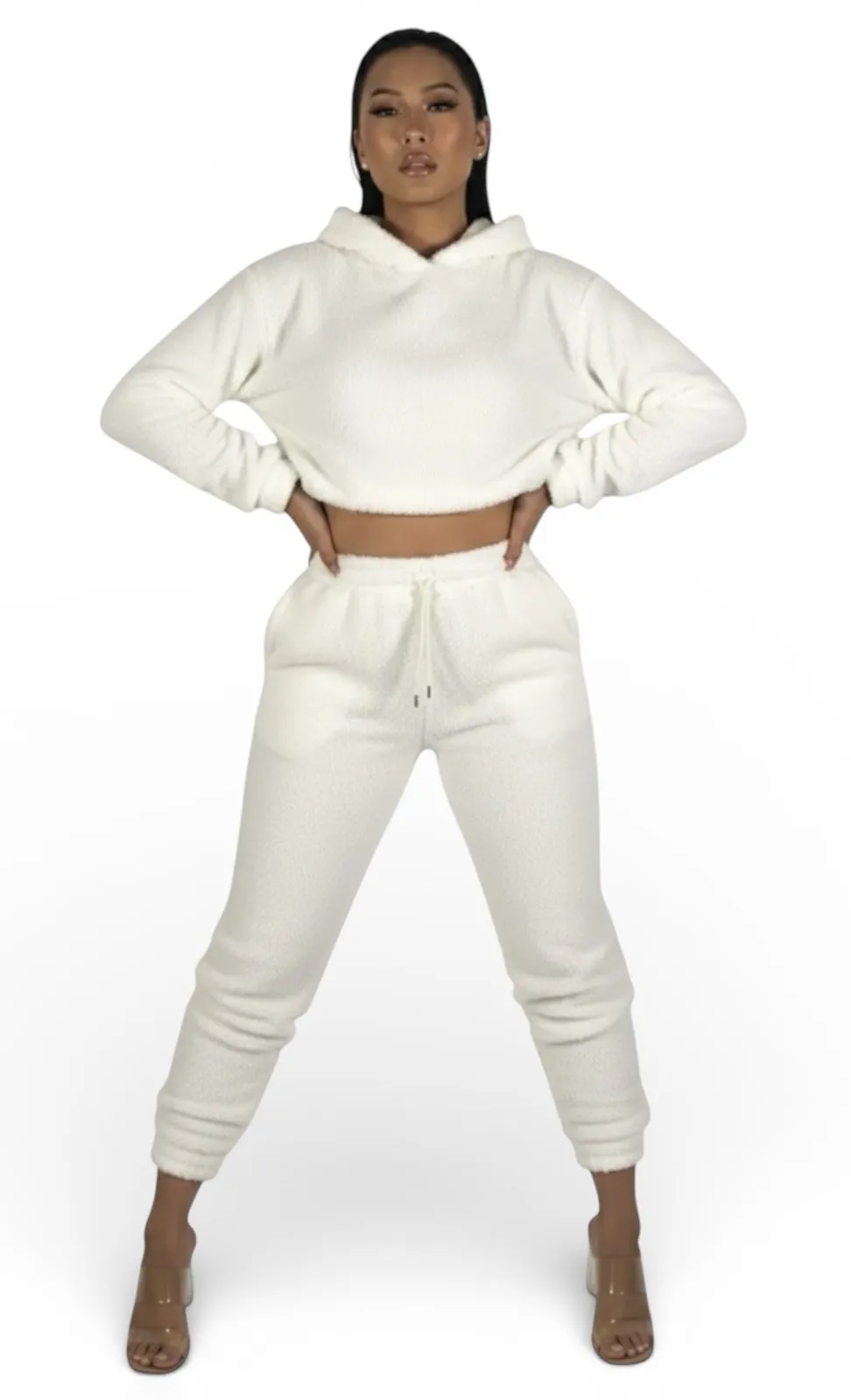 Two piece matching set Teddy fleece knit fabric Soft textured cozy hand feel Solid white color Cropped hoodie top Pullover style Attached hooded neckline Long sleeve Relaxed fit top Elastic waist jogger pants Adjustable drawstring closure Mid rise Tapered jogger leg Elastic cuffed hem Stretch Lounge to streetwear versatility Cozy Clean girl Neutral Minimalist Streetwear Loungewear Casual chic Everyday