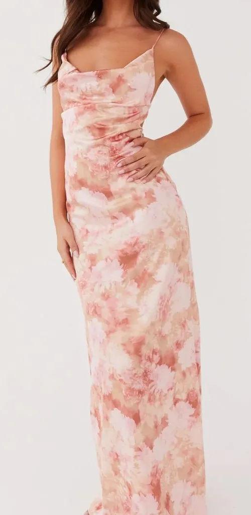 Peppermayo Exclusive Brand New with tags Dancing In The Sky Maxi Dress. Exclusive "Flower Garden" print. this dress is crafted from luxurious satin fabric with a flattering bias cut. Perfect for those enchanted evenings. whether you're dancing under golden skies or embracing balmy nights. Elevate your nightlife with this captivating silhouette. - Maxi dress - Bias cut - Cowl neckline - Fully lined - Open low back - Adjustable straps - Side seam zipper - Tie at back - Satin fabric - Exclusive Peppermayo print - 96% Polyester. 4% Elastane Measurements: PTP: 15.5” Waist: 13” across (26”) Dress length: 60” from top of shoulder strap to bottom hem