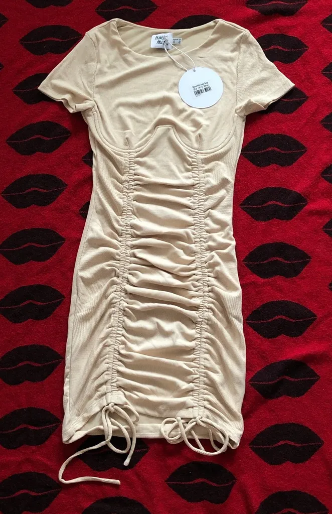 NWT Princess Polly stormi beige dress! Tagged size 8 but fits a small best! Material is good and stretchy! Has adjustable ties to make it shorter or longer! Makes your figure look good π has underwire in the bust. Length: 33 inches Bust: 28-34 inches Waist: 22-28 inches