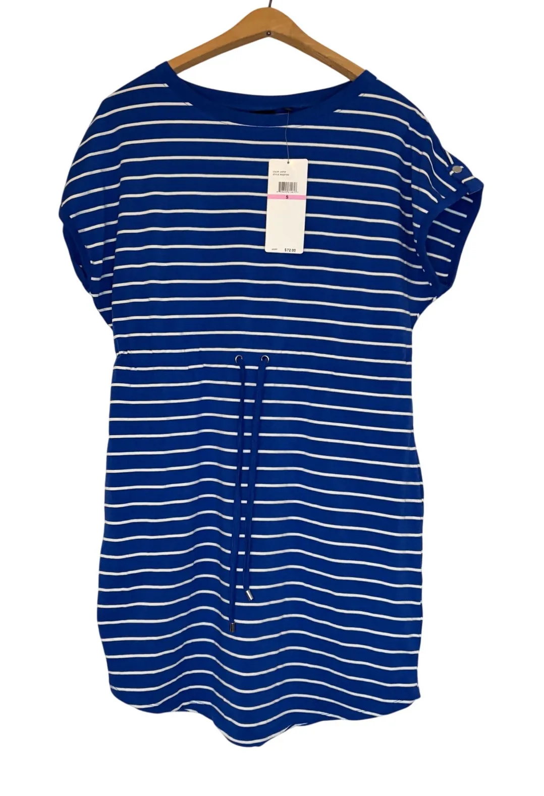 NWT Rafaella womens blue white striped short sleeve knee length dress. Drawstring waist Size S 57% cotton, 38% modal, 5% spandex Pit to pit - 20 inch Length - 34 inch Waist - 16.5 inch with drawstring Skirt length - 20 inch Sleeve - 9 inch