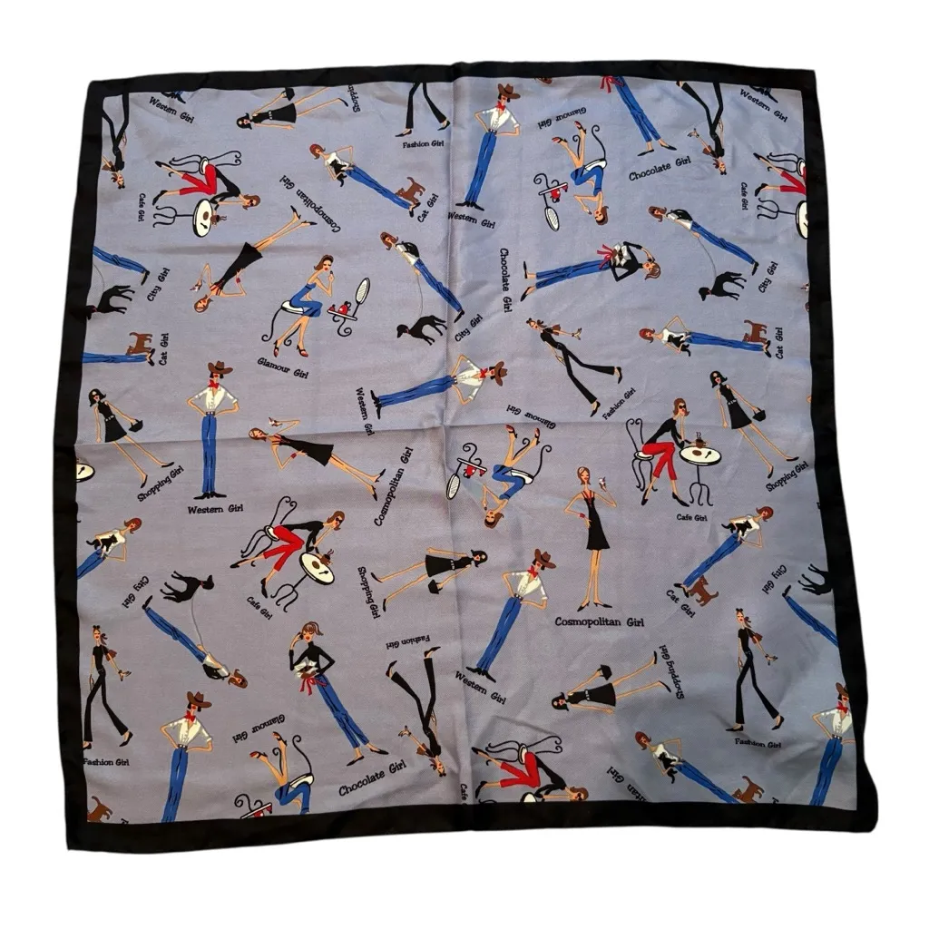 Rare Vintage The Girls Helen Welsh Designer 100% Silk Square Scarf. 21” square. Fashion scattered print in denim. Unique silk scarf featuring a collection of female fashion figures designed by Helen Walsh.