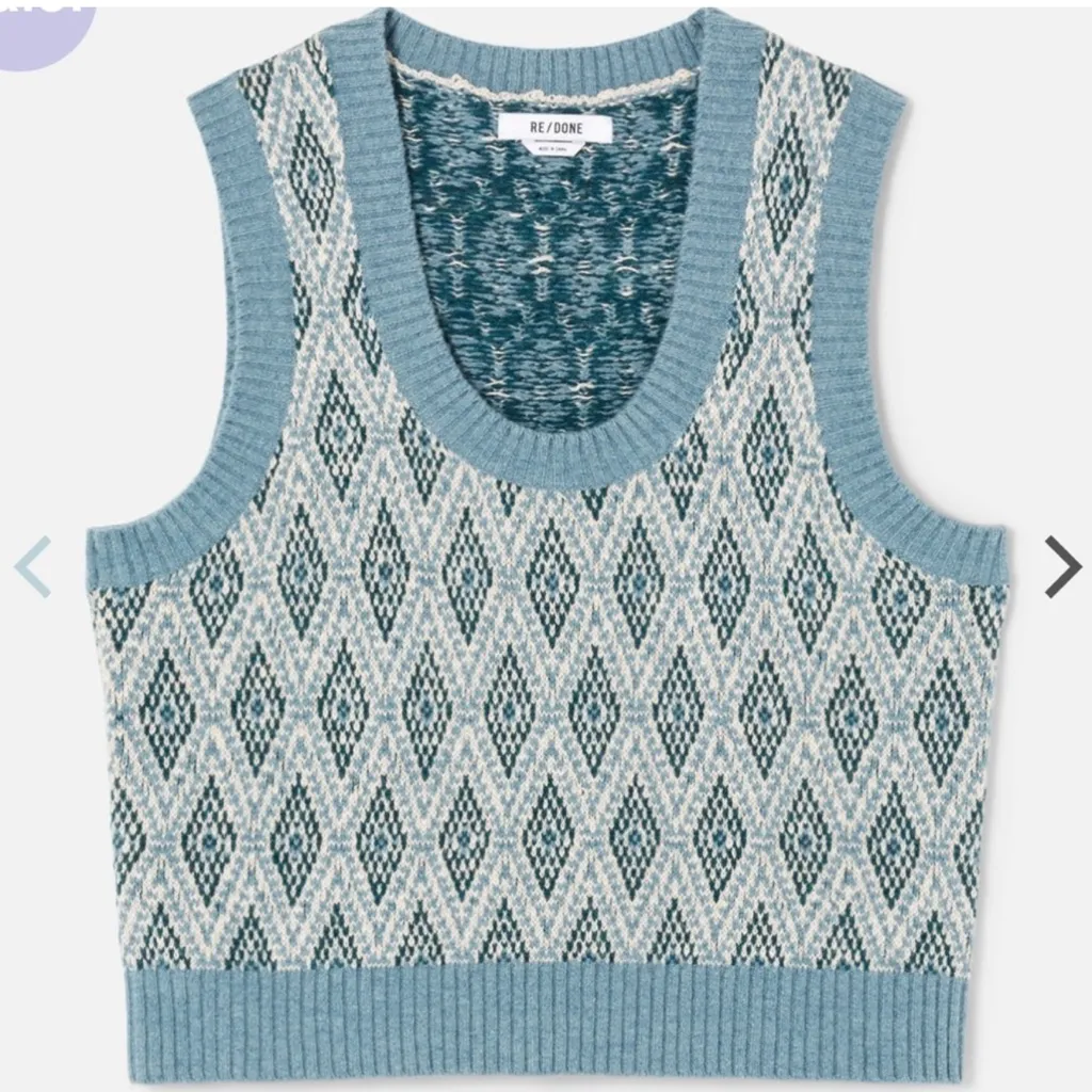 The Retro Geo sweater Vest in Sage Geo stitch knit in fine wool variegated pattern. Fit Intent Short... Show more