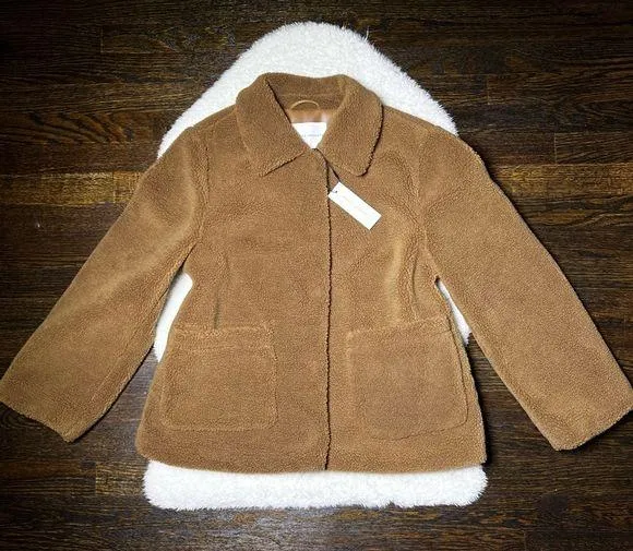 New with tags coat from Rebecca Minkoff. Brown. Fuzzy teddy / sherpa / faux fur texture. Hidden snap... Show more