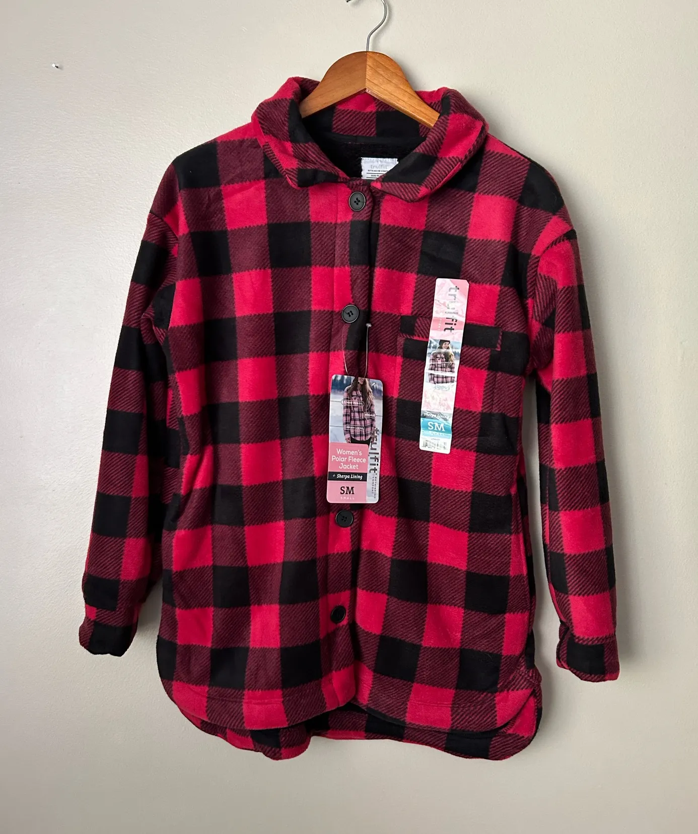Brand new tags attached Sherpa fleece jacket. Red/pink and black plaid print. Has pockets. Button cl... Show more